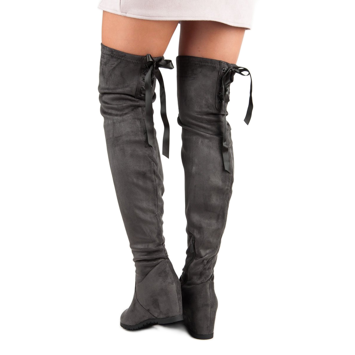 Gli stivali sopra il ginocchio in pelle scamosciata ecologica in un'elegante tonalità di grigio sono un'aggiunta perfetta a qualsiasi guardaroba. La tomaia alta, sopra il ginocchio, non solo aggiunge carattere, ma protegge anche efficacemente dal freddo. Cerniera e allacciatura estremamente pratiche consentono una vestibilità perfetta e una facile indossabilità.
