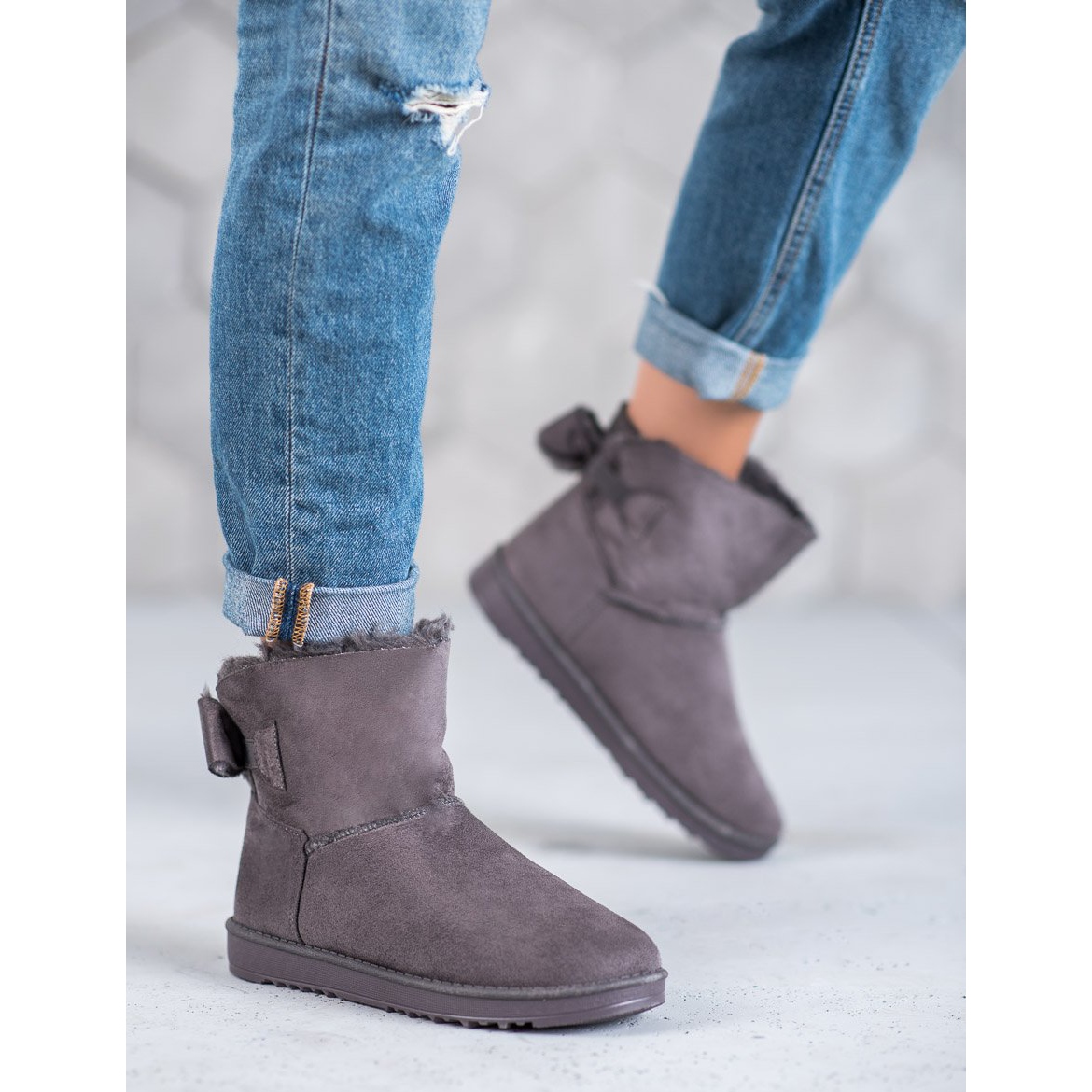 I mukluk grigi con fiocco sono la scelta perfetta per la prossima stagione autunno-inverno per ogni donna che apprezza la combinazione di comfort e stile. Realizzate in pelle scamosciata ecologica, queste scarpe non solo hanno un aspetto estremamente elegante, ma avvolgono piacevolmente i tuoi piedi, mantenendoli al caldo grazie all'isolamento in pelliccia all'interno.