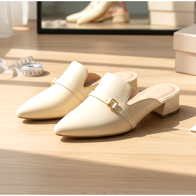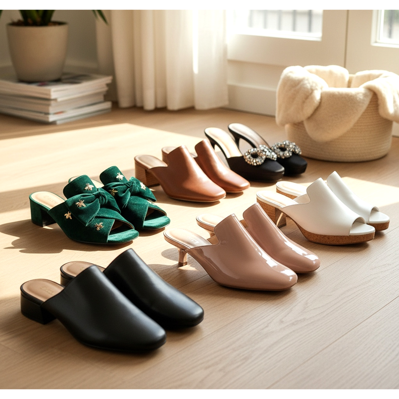 Mules con tacco basso (tacco gattino) aggiungono un tocco di eleganza senza rinunciare alla comodità. Il tacco basso di 3-5 cm slancia la figura e permette di camminare comodamente tutto il giorno.