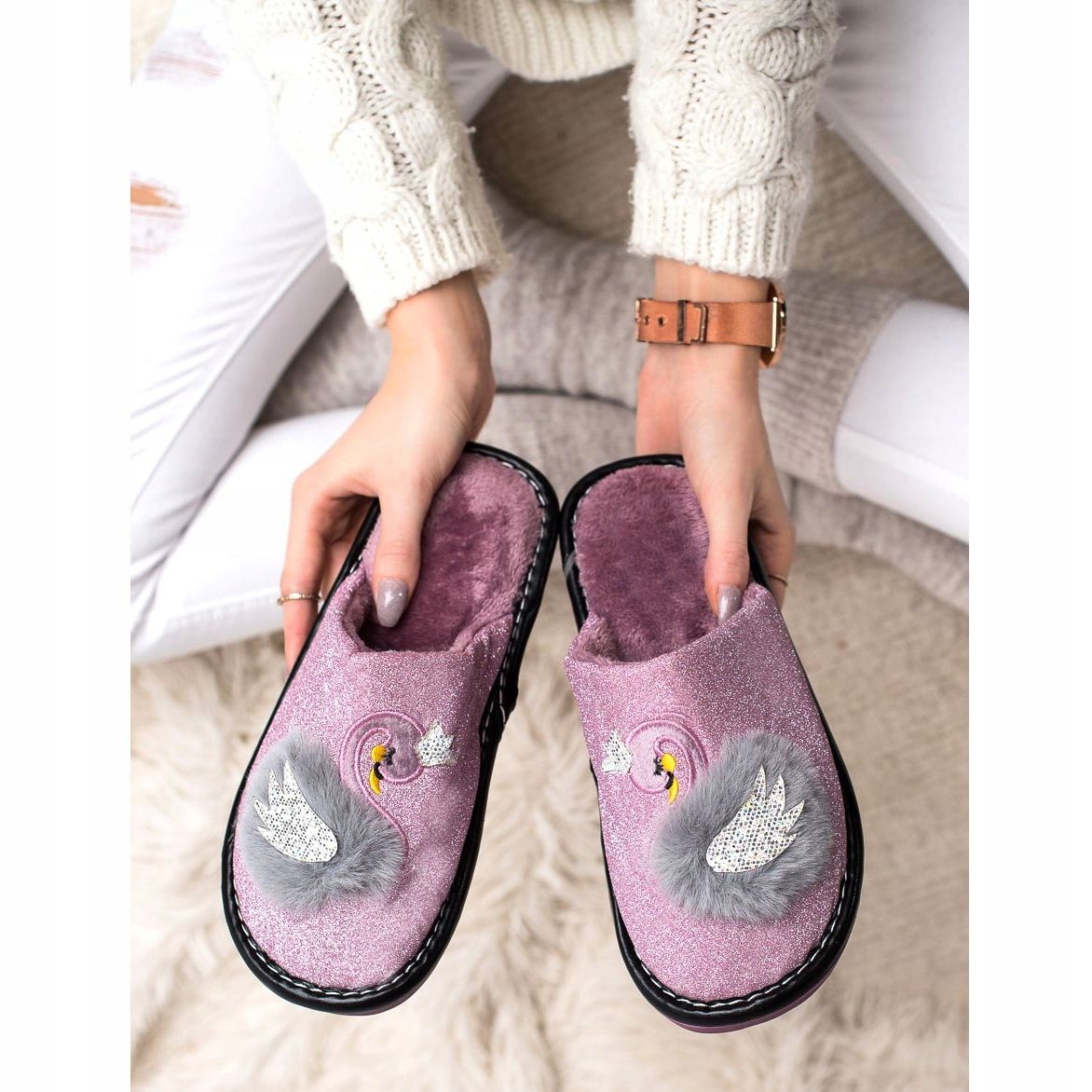 Scopri il comfort e lo stile quotidiano con le pantofole Bona. Queste affascinanti pantofole viola deliziano non solo con il loro colore, ma anche con un'originale applicazione a forma di cigno che conferisce loro un carattere unico. Realizzati in materiale broccato, hanno un aspetto alla moda ed elegante, e la morbida pelliccia all'interno garantisce comfort anche nelle giornate più fredde.