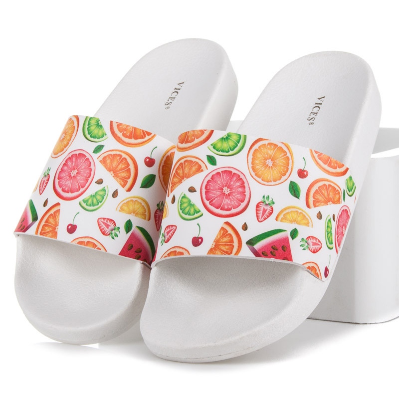 Scopri uno stile rinfrescante con le infradito Vices con motivo fruttato in bianco! Se vuoi aggiungere un po' di freschezza ed energia al tuo look estivo, queste infradito sono la soluzione perfetta. Realizzati in pelle ecologica, si caratterizzano per l'alta qualità e il comfort di indossabilità, che li rendono un'ottima scelta per l'uso quotidiano.