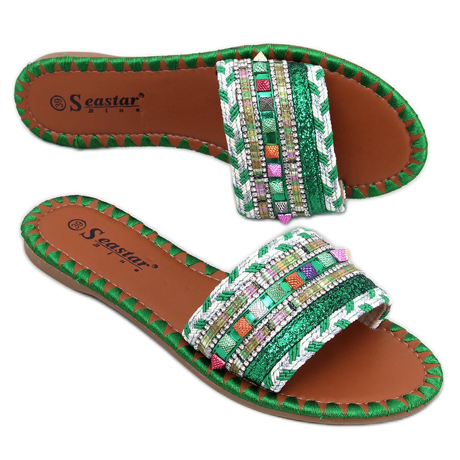 Realizzate in tessuto di alta qualità, queste infradito non sono solo alla moda, ma anche comode da indossare. La mancanza di punta li rende ariosi, il che li rende una scelta perfetta per le giornate calde. Il colore verde e le decorazioni fantasia con pietre e borchie aggiungono loro originalità, rendendoli un complemento perfetto per lo styling di tutti i giorni.