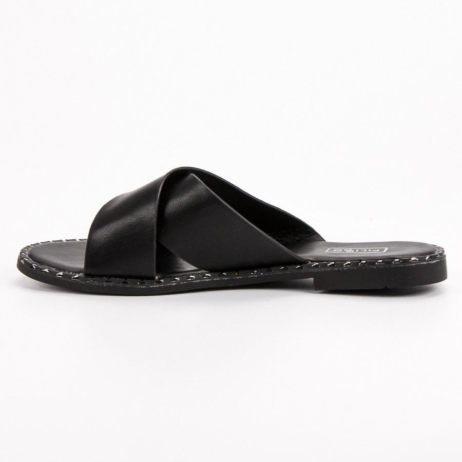 Realizzate in ecopelle, queste infradito offrono resistenza e facilità di manutenzione. La suola in plastica liscia aumenta ulteriormente il loro comfort, e il design moderno combinato con delicate borchie aggiunge loro carattere.