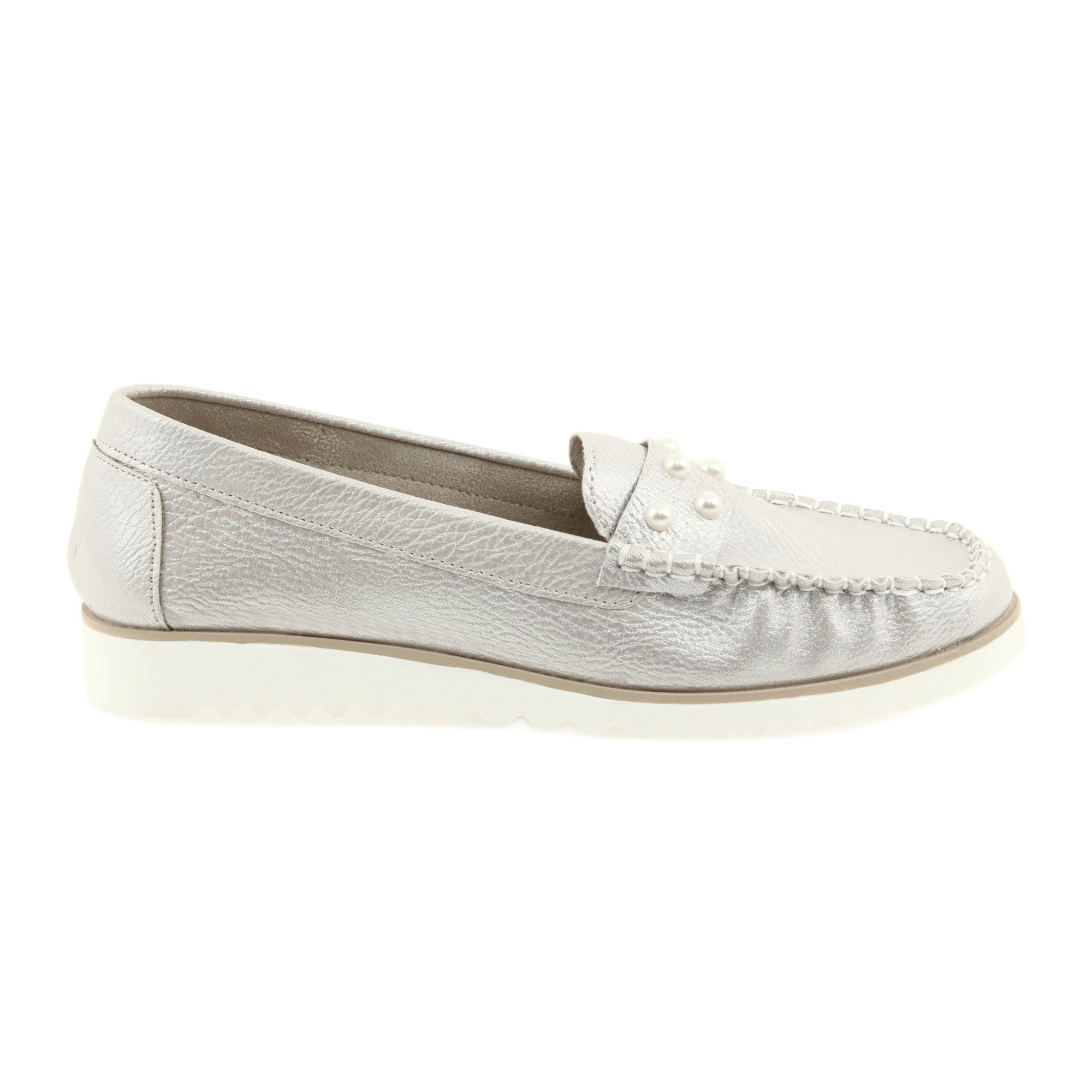 Eleganti mocassini per la primavera e l'estate: una tomaia in beige perlaceo decorato con perle delicate e sottili dettagli in argento. La combinazione di una forma classica con un accento femminile significa che il modello 725 è ottimo sia per l'ufficio che per una passeggiata o per l'incontro con gli amici.