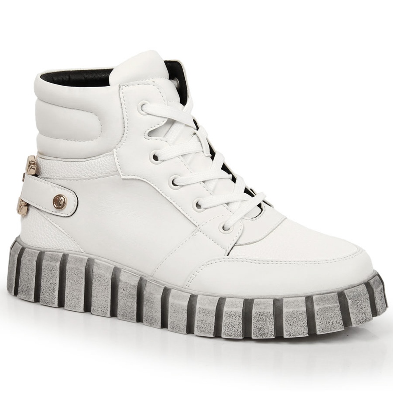 La parte esterna è realizzata in pelle ecologica in un elegante colore bianco, che la rende perfettamente adatta alle tendenze attuali. L'interno delle scarpe è rifinito con uno chignon e un cappotto in montone, che garantisce una piacevole sensazione di calore e comfort da indossare anche nelle giornate più fredde. L'altezza della tomaia è di circa 11 cm, il che aggiunge carattere e sottolinea sottilmente la linea della caviglia.