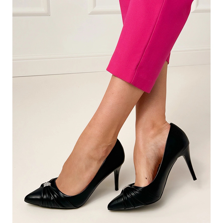 Le pompe classiche nere su un tallone con zirconi sono un'ottima scelta per le donne che vogliono aggiungere un bagliore speciale alle loro stilizzazioni. Realizzati in pelle ecologica di alta qualità, queste scarpe combinano eleganza e comfort di indossare. Il morbido inserto in pelle ecologica offre comfort anche durante lunghe ore, il che li rende perfetti per ogni occasione.