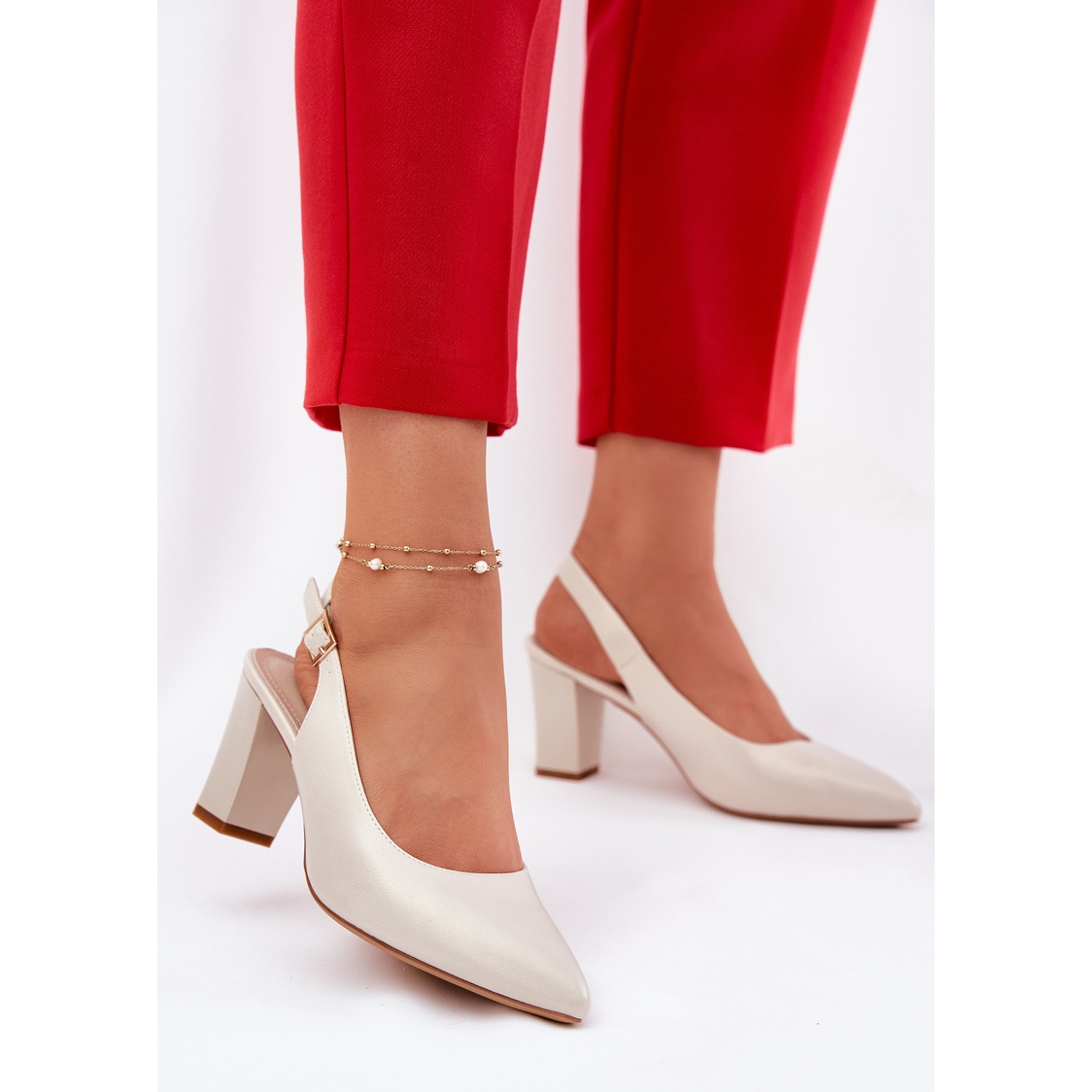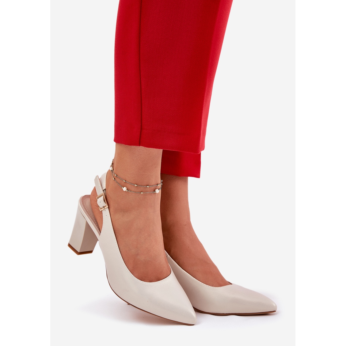 Queste pompe sono incorporate su un palo stabile alto 7,5 cm, che fornisce supporto e comfort adeguati quando si indossano. Grazie alla cintura regolabile con una fibbia, li abbinerai perfettamente al tuo piede e il tallone aperto ti darà leggerezza e freschezza nello stile.
