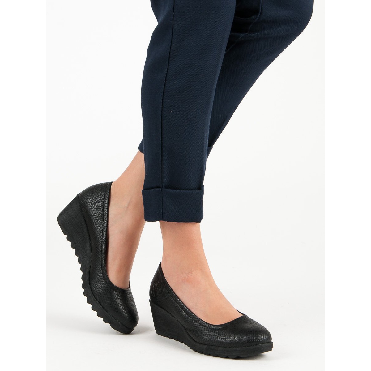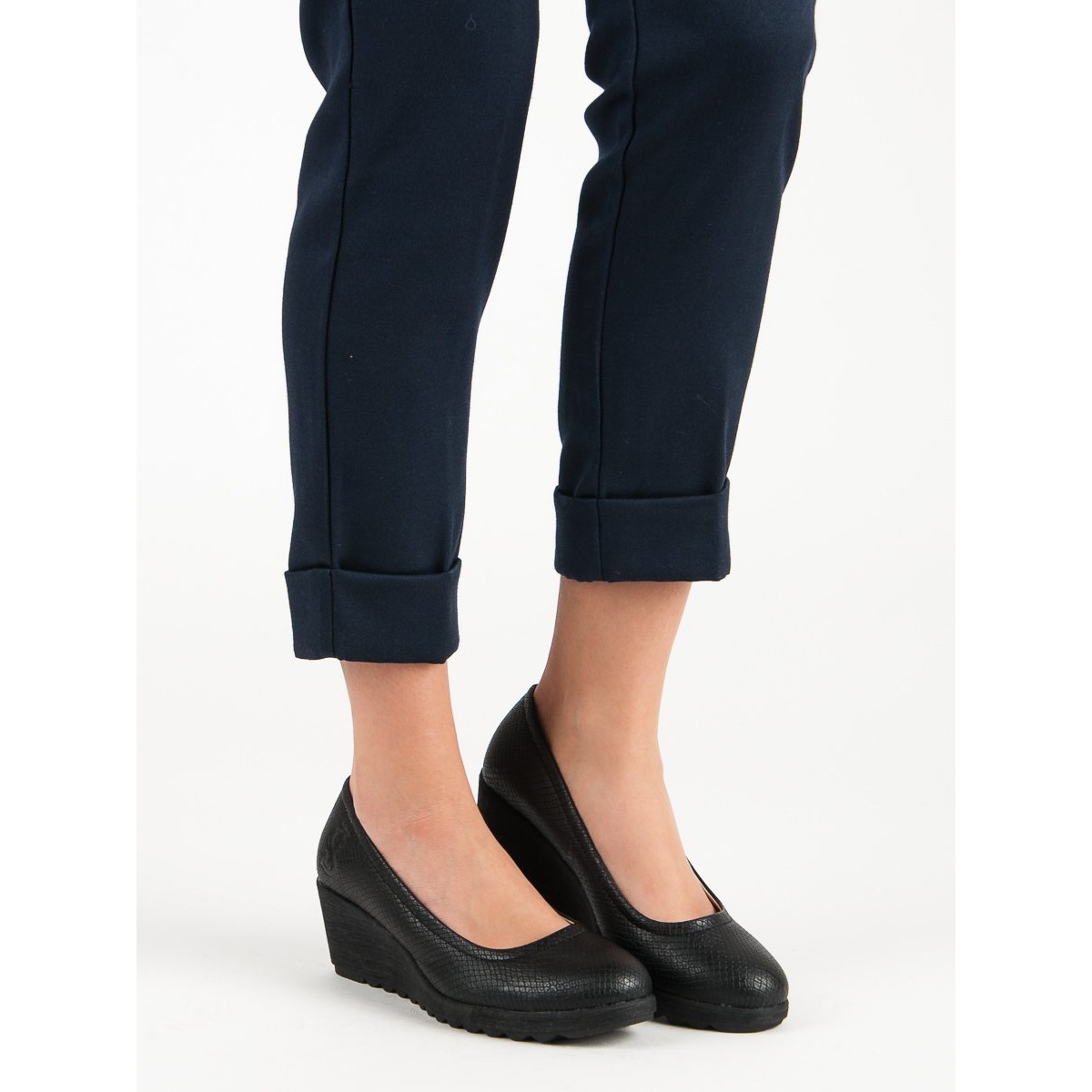 Le décolleté sono caratterizzate da un tacco stabile e incorporato e da una suola in gomma con battistrada, che garantisce comfort di calzata e passo sicuro. All'interno delle scarpe è presente un comodo sottopiede in pelle ecologica, il che significa che anche le lunghe ore trascorse nelle scarpe non saranno stancanti.