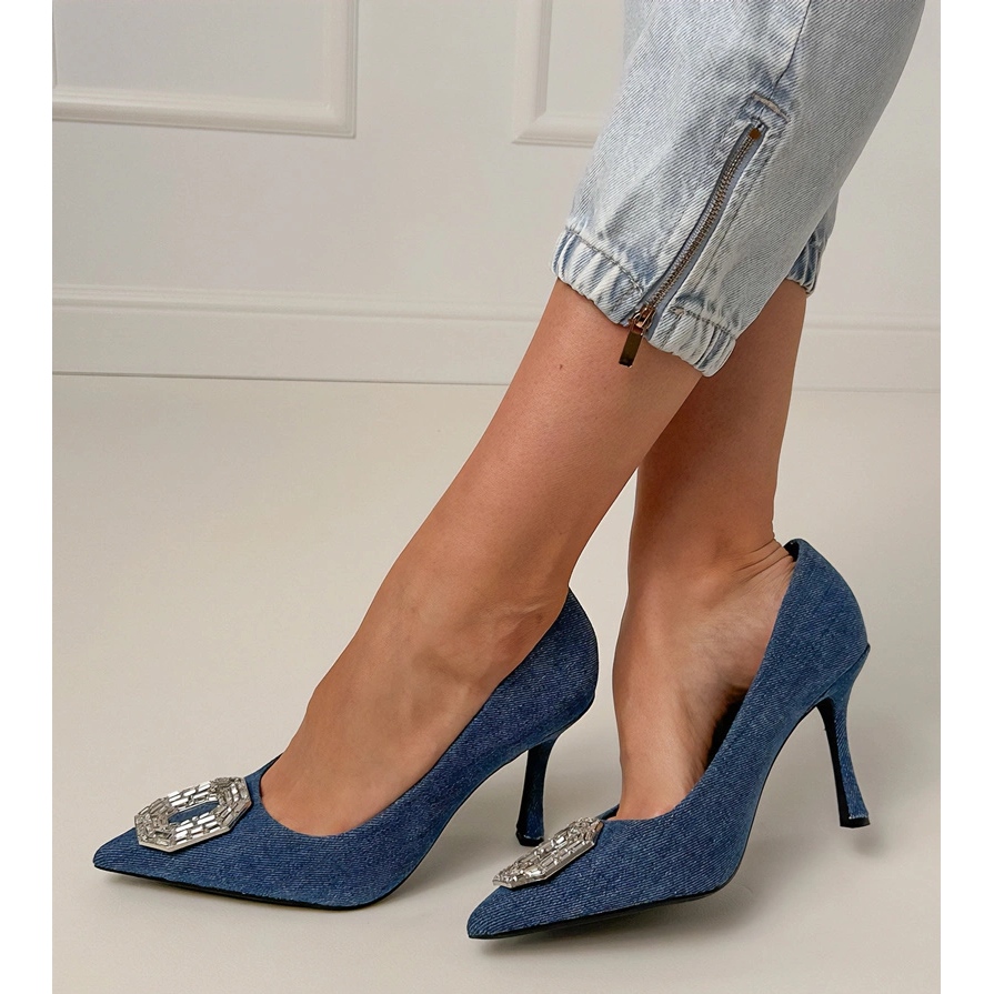 Dettagli: Pompe in denim su un perno con zirconi blu
