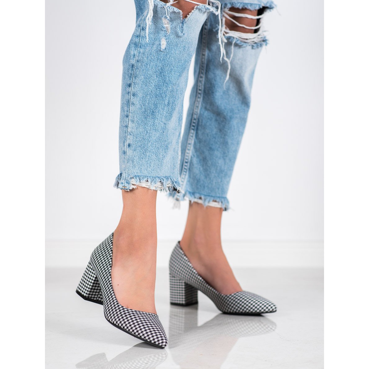 Grazie allo stabile tacco largo alto 6,5 cm, le décolleté garantiscono comfort anche quando si cammina a lungo. Il loro naso rotondo aggiunge ulteriore sottigliezza, e il motivo pied de poule bianco e nero alla moda li rende un complemento perfetto sia per gli stili quotidiani che per quelli più eleganti.