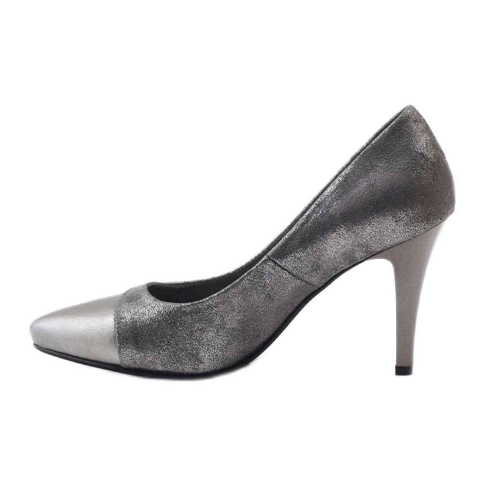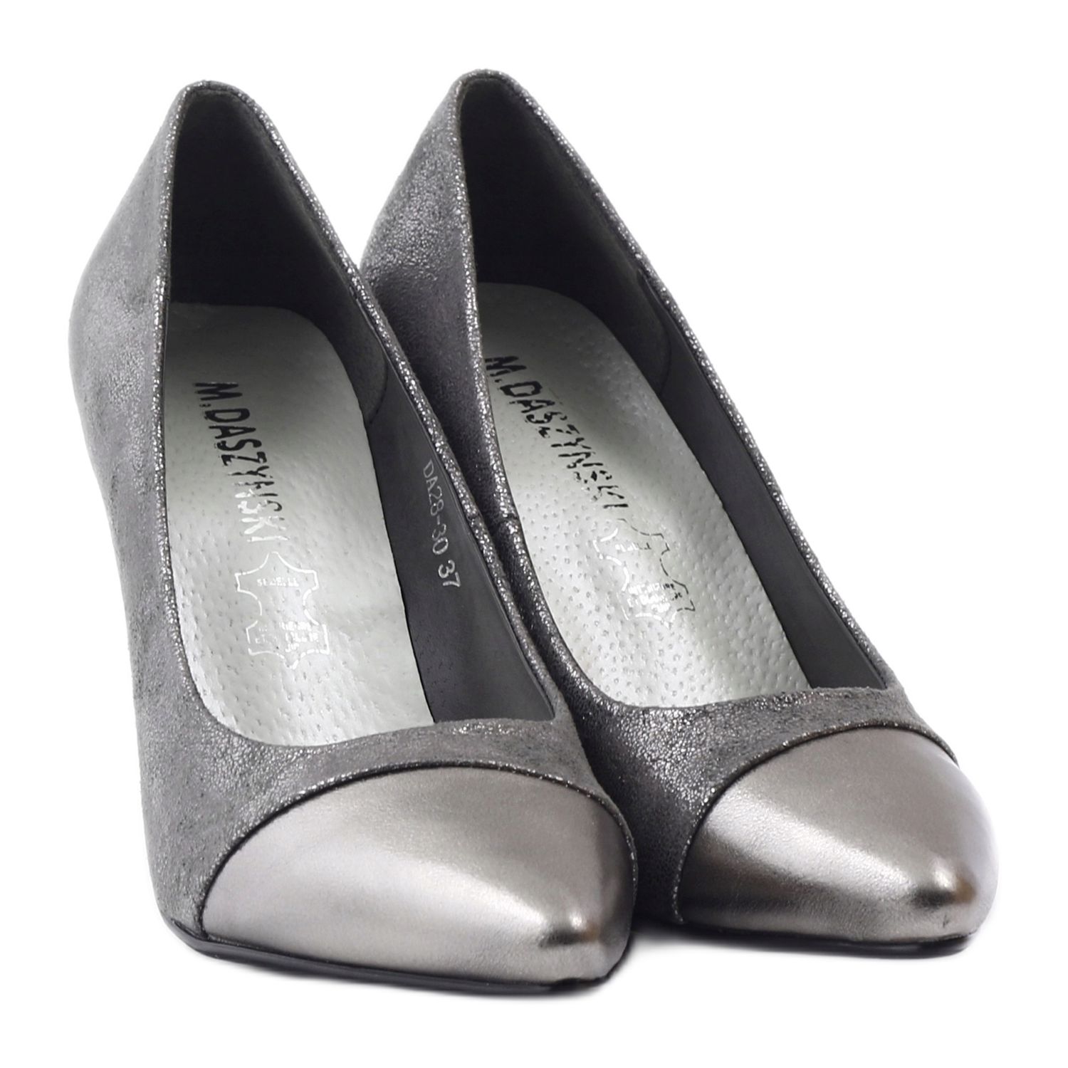 Le décolleté lucide M.Daszyński DA28 sono una scelta elegante per le donne che vogliono combinare il comfort con un look alla moda. Offerte in una tonalità di grigio che brilla sottilmente con l'argento, queste scarpe eleganti faranno sicuramente girare la testa. La punta argentata conferisce loro un carattere unico, rendendoli un complemento perfetto sia per gli stili quotidiani che per quelli serali.