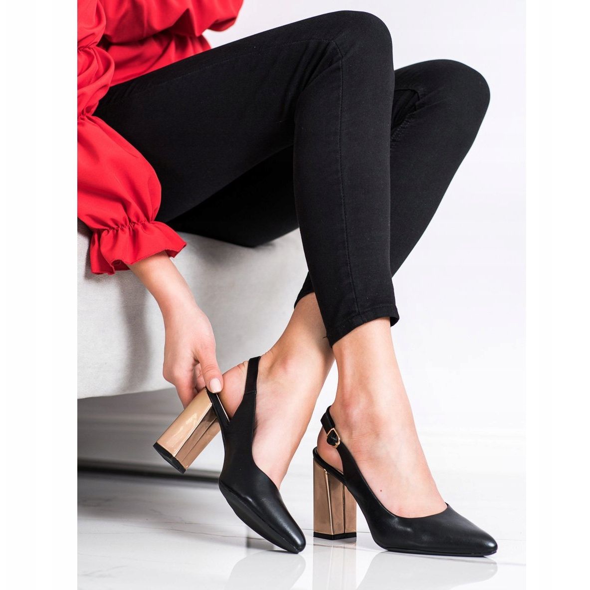 Il tacco alto dorato di 9,5 centimetri non solo aggiunge eleganza, ma allunga anche otticamente le gambe. Inoltre, la fibbia posizionata sopra la caviglia è un accento pratico ed elegante che garantisce una vestibilità adeguata. Le décolleté hanno una suola con battistrada in plastica, che garantisce comfort e stabilità durante la camminata.