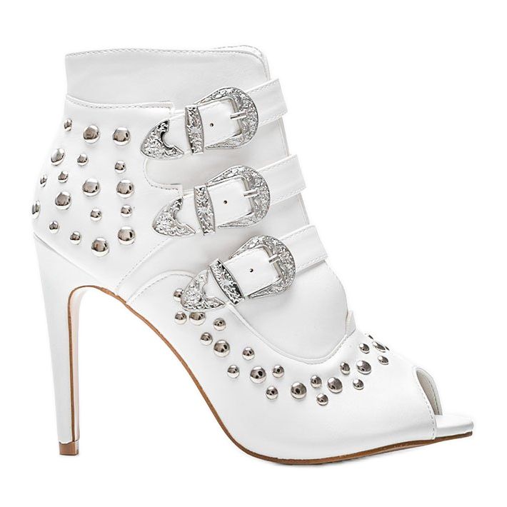 Vi presentiamo le décolleté bianche Abigail con tacco alto, che uniscono l'eleganza ad uno stile unico. Questi tacchi alti si distinguono per una bellissima finitura, grazie a borchie decorative e accattivanti fibbie ornamentali che donano loro carattere. Le fibbie sono fissate su nastri elastici, che garantiscono una perfetta aderenza al piede e comfort da indossare.