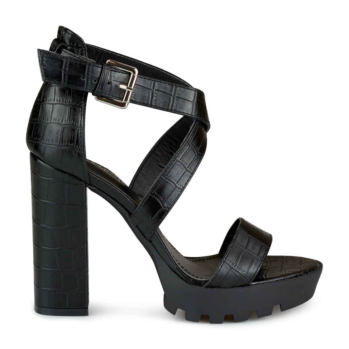 Realizzati in pelle ecologica di alta qualità, questi sandali si distinguono per un originale motivo in finta pelle di coccodrillo, che conferisce loro un carattere unico. Il colore nero li fa abbinare a molti stili, aggiungendo loro classe ed eleganza. Le punte aperte e la comoda chiusura con fibbia garantiscono una facile calzata e una perfetta aderenza al piede.