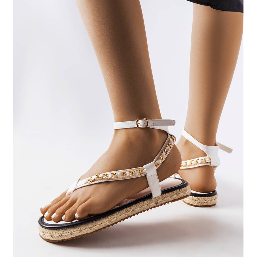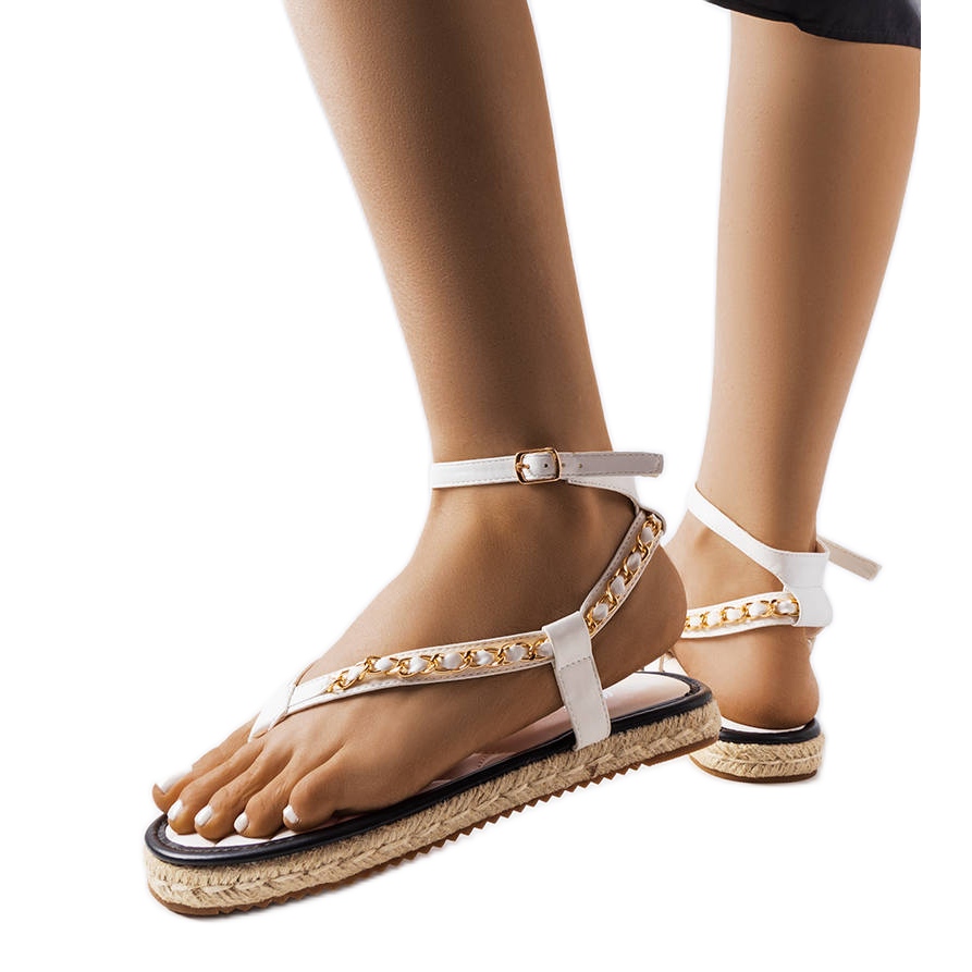 Sandali bianchi decorati con la catena Varieur: leggerezza e stile in una puntata estiva. Il modello B-273 è una combinazione della comodità di espadrilles e libertà di giapponese, perfetta per le passeggiate quotidiane e le uscite delle vacanze. Una tomaia luminosa ed elegante decorata con una catena sottile e dorata aggiunge carattere e la suola in gomma beige garantisce stabilità su varie superfici.