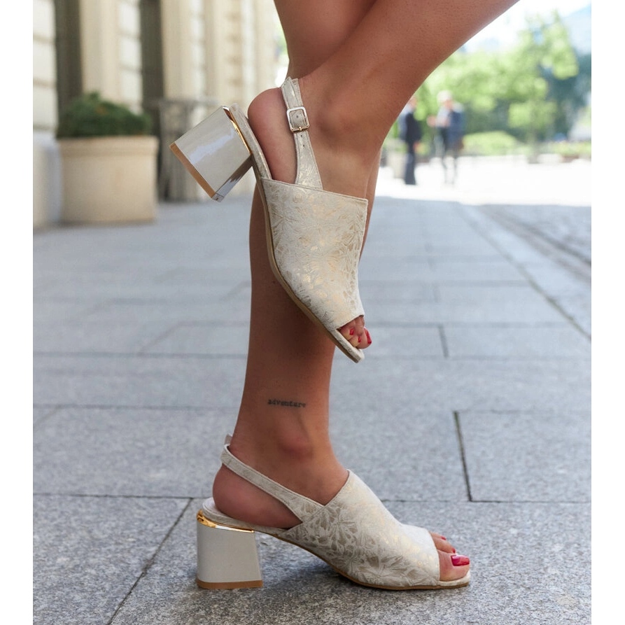 I sandali su un blocco con un inserto in pelle nuna in una tonalità beige sono un'ottima scelta per le giornate estive, combinando comfort e design alla moda. La loro forma classica in un tallone alto e stabile con un'altezza di 5,5 cm li rende non solo a proprio agio, ma promettono anche eleganza in ogni stilizzazione. Realizzati in pelle scamosciata ecologica, questi sandali non solo sembrano belli, ma si prendono anche cura dell'ambiente. L'inserto in pelle offre un comfort di usura elevato e la fibbia ti consente di adattarti facilmente al piede.