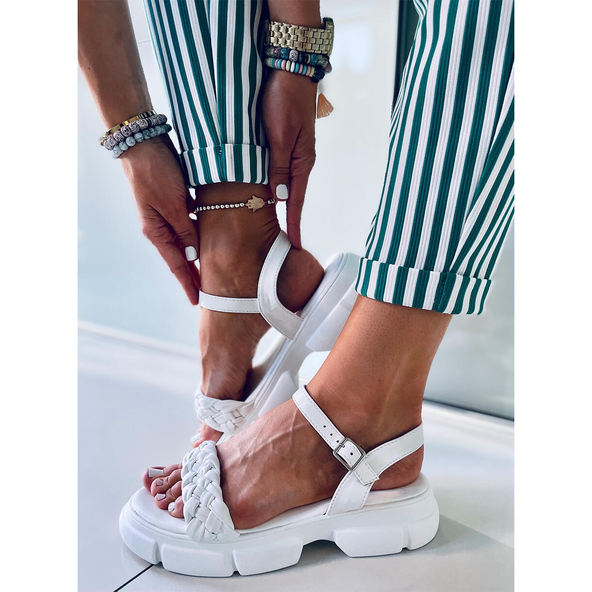 Il cinturino intrecciato attira l'attenzione e si adatta perfettamente al design minimalista e liscio dei sandali, che li rende un complemento perfetto per qualsiasi stile quotidiano. Grazie alla chiusura con fibbia, i sandali sono facili da indossare e regolare, garantendo una perfetta aderenza al piede.