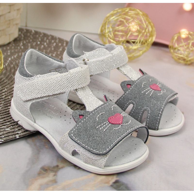I sandali sono di colore grigio argento con accenti che brillano al sole, che piaceranno sicuramente alle piccole fashioniste. Particolare attenzione è rivolta alle graziose decorazioni a forma di gatti, che aggiungono un carattere unico alle scarpe.