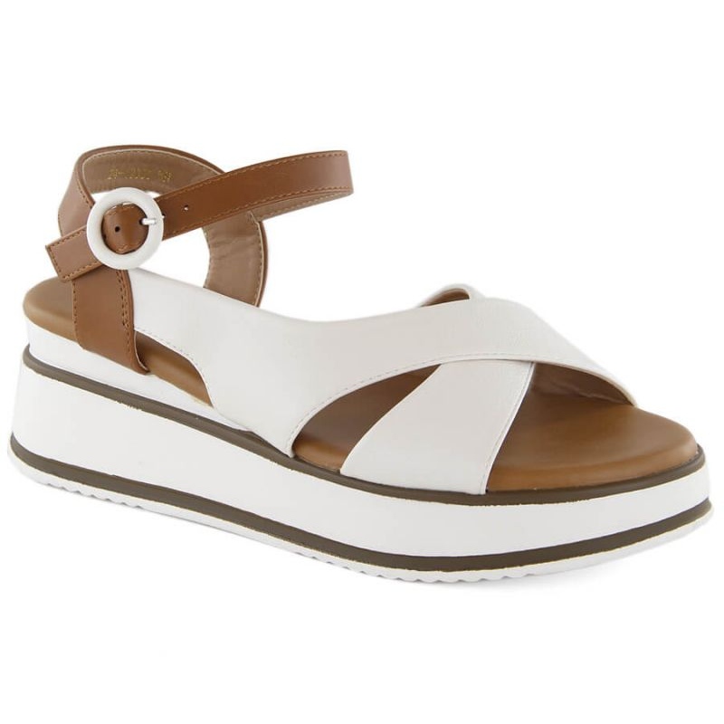 Questi sandali sono fissati con una fibbia, che ti consente di adattarti facilmente a qualsiasi piede. La tomaia e la fodera sono realizzate in pelle sintetica, che garantisce la durata e la facilità di cura. Il colore bianco universale fa fondere i sandali perfettamente con varie stilizzazioni estive.