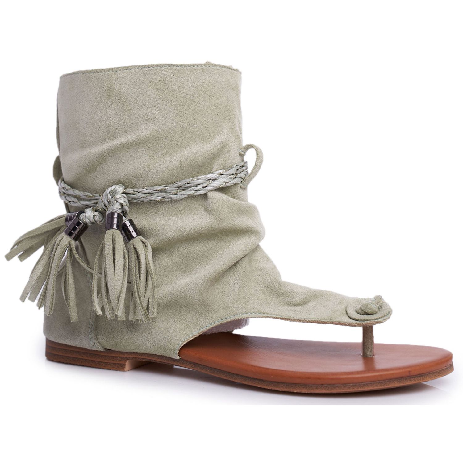 Questi sandali si distinguono non solo per il loro aspetto insolito, ma anche per le soluzioni pratiche. La tomaia alta aggiunge fascino ed eleganza, e le frange ne sottolineano il carattere moderno. Realizzati in pelle scamosciata ecologica, forniscono non solo un aspetto estetico, ma anche comfort da indossare. La suola sintetica e il sottopiede ecologico le rendono perfette per le giornate estive.