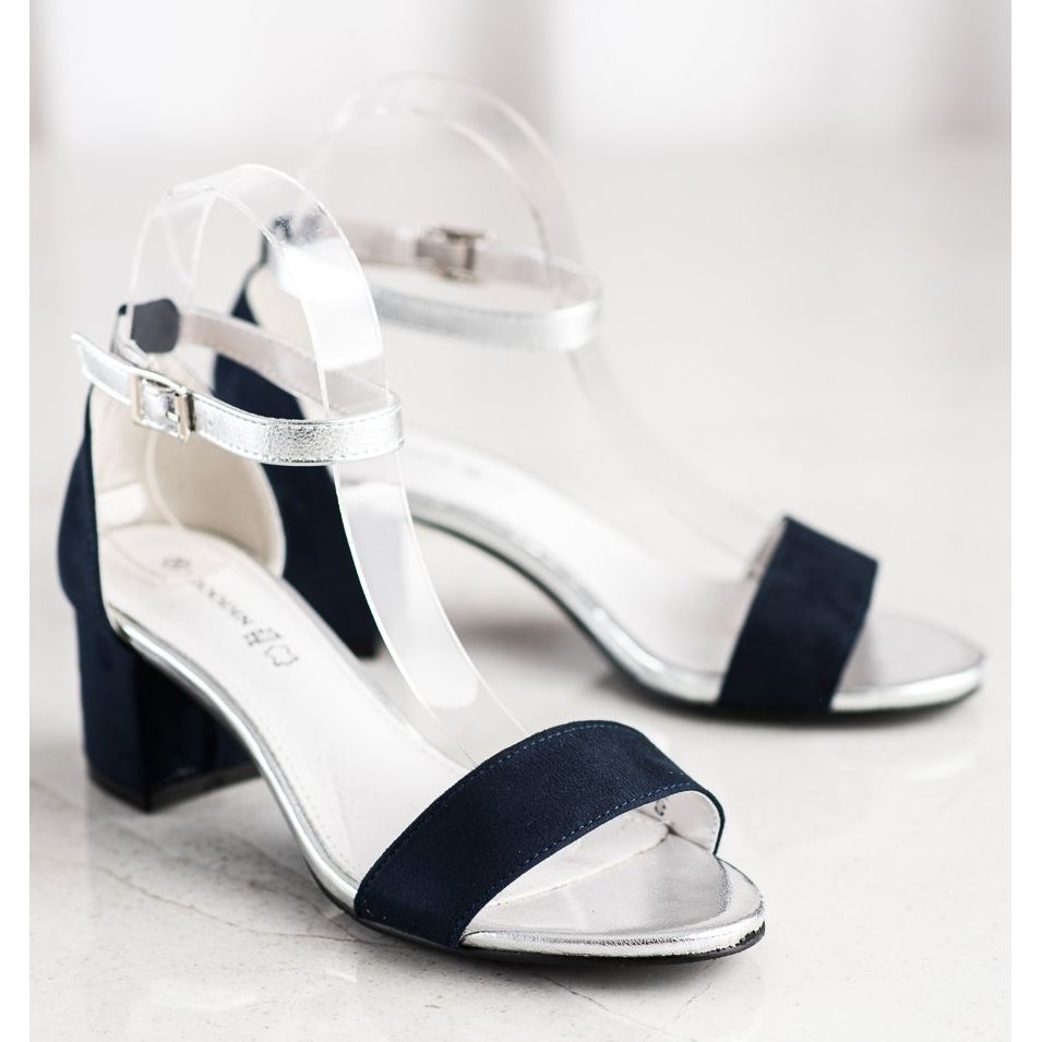 Realizzati con materiali di alta qualità, questi sandali presentano una tomaia in similpelle e pelle scamosciata blu navy, che conferisce loro un look moderno ed elegante. La striscia argentata posizionata sulla parte superiore della scarpa accentua sottilmente l'intero look, aggiungendo un po' di lucentezza. Un tacco aperto e una semplice fibbia assicurano un comodo indossare e togliere le scarpe, estremamente pratico nei momenti più intensi.