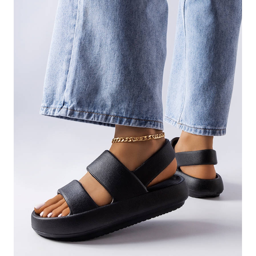 Le infradito sono dotate di un cinturino sul tallone che offre stabilità, cosa particolarmente importante durante le passeggiate più lunghe. Grazie al loro colore nero universale, questi sandali si abbinano perfettamente ai pantaloncini della tuta o ad una maglietta ampia, creando un look estivo alla moda.
