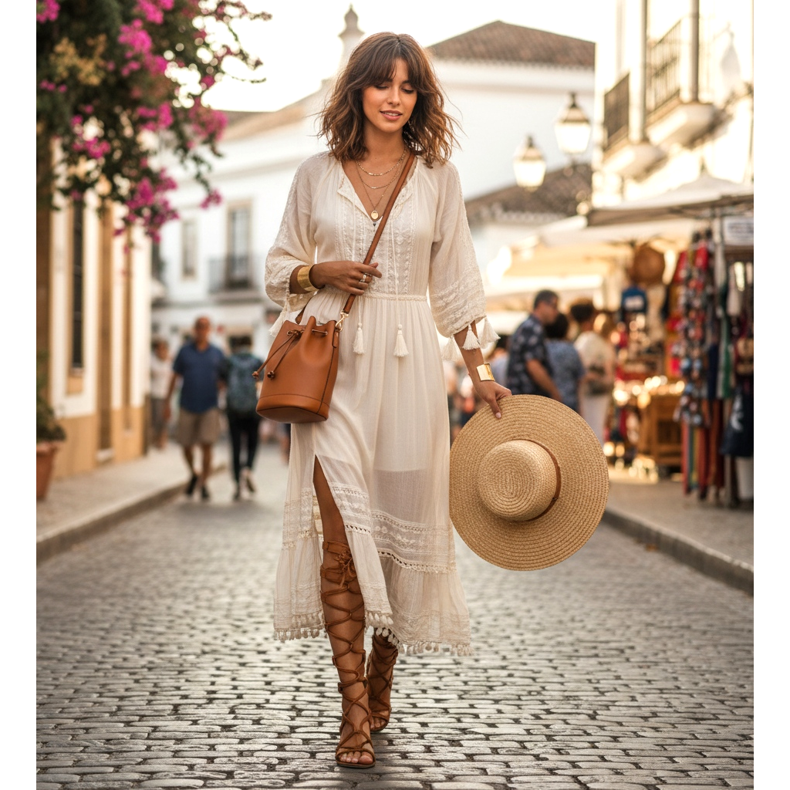 Un arioso abito in stile boho con ricami o frange si armonizza naturalmente con l'estetica in pelle delle scarpe da gladiatore. Scegli sandali cognac o marrone naturale con un abito nei toni dell'ecrù, della terracotta o del verde tenue. Questo set funziona sia sul campo da spiaggia che nelle fiere estive o nei vernissage.