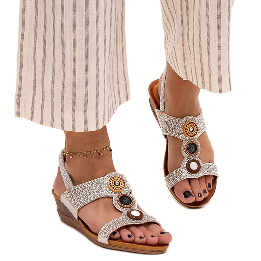 I sandali decorati con zirconi efficaci introducono una nota di bagliore per ogni stilizzazione estiva, rendendoli parte integrante del guardaroba di ogni donna alla moda. Il cuneo alto 4 cm dà loro un aspetto caratteristico, che si adatta perfettamente alle tendenze attuali. L'argento in combinazione con una suola beige significa che questi sandali corrispondono a molti abiti, dagli abiti ariosi ai pantaloncini estivi.