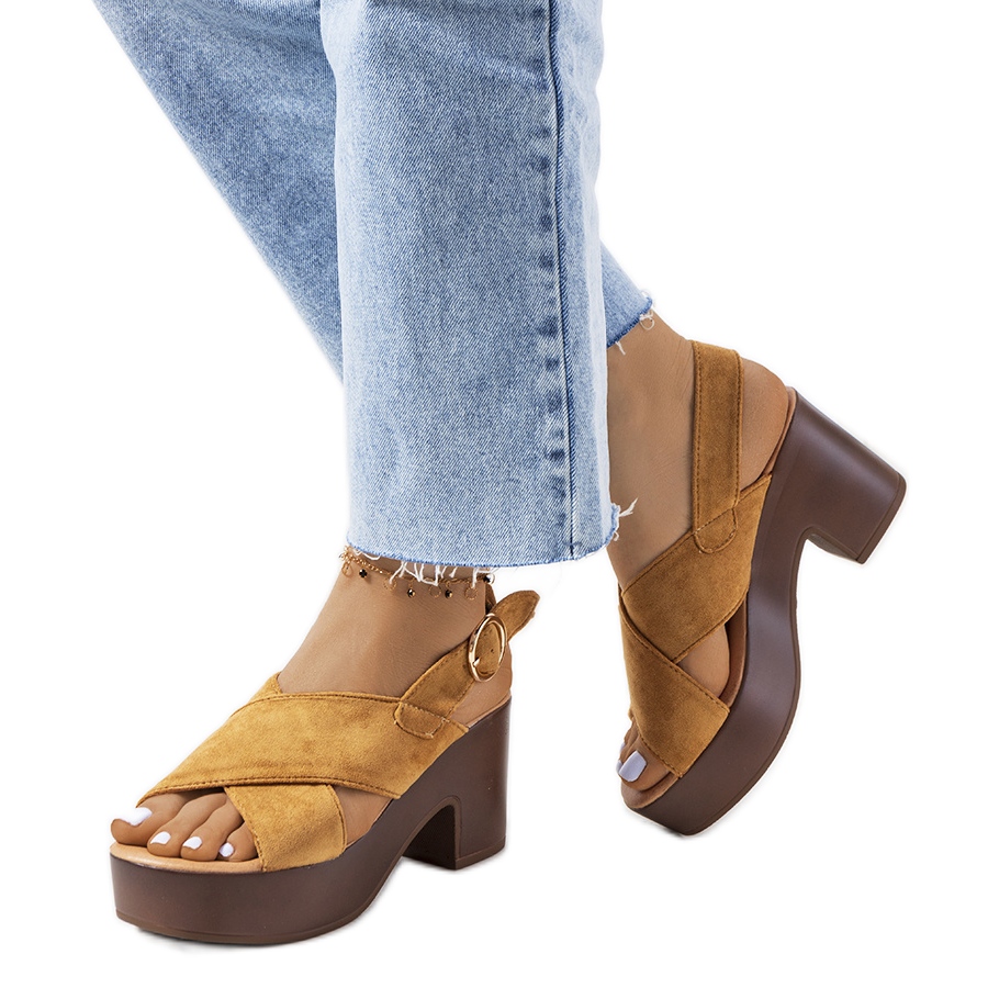 La tomaia è realizzata in pelle ecologica scamosciata di alta qualità, che non solo conferisce loro un carattere unico, ma garantisce anche il comfort di indossarli tutto il giorno. I sandali sono disponibili nel colore cammello, che si abbina perfettamente a vari outfit estivi.