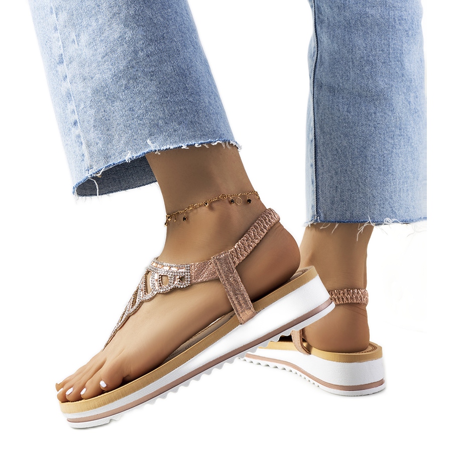 La loro bella tonalità di rosa champagne e le delicate decorazioni sotto forma di zirconi e strass conferiscono loro una lucentezza unica, abbinandosi perfettamente agli outfit estivi. L'altezza della piattaforma di 3,5 cm garantisce stabilità e allo stesso tempo allunga otticamente le gambe.