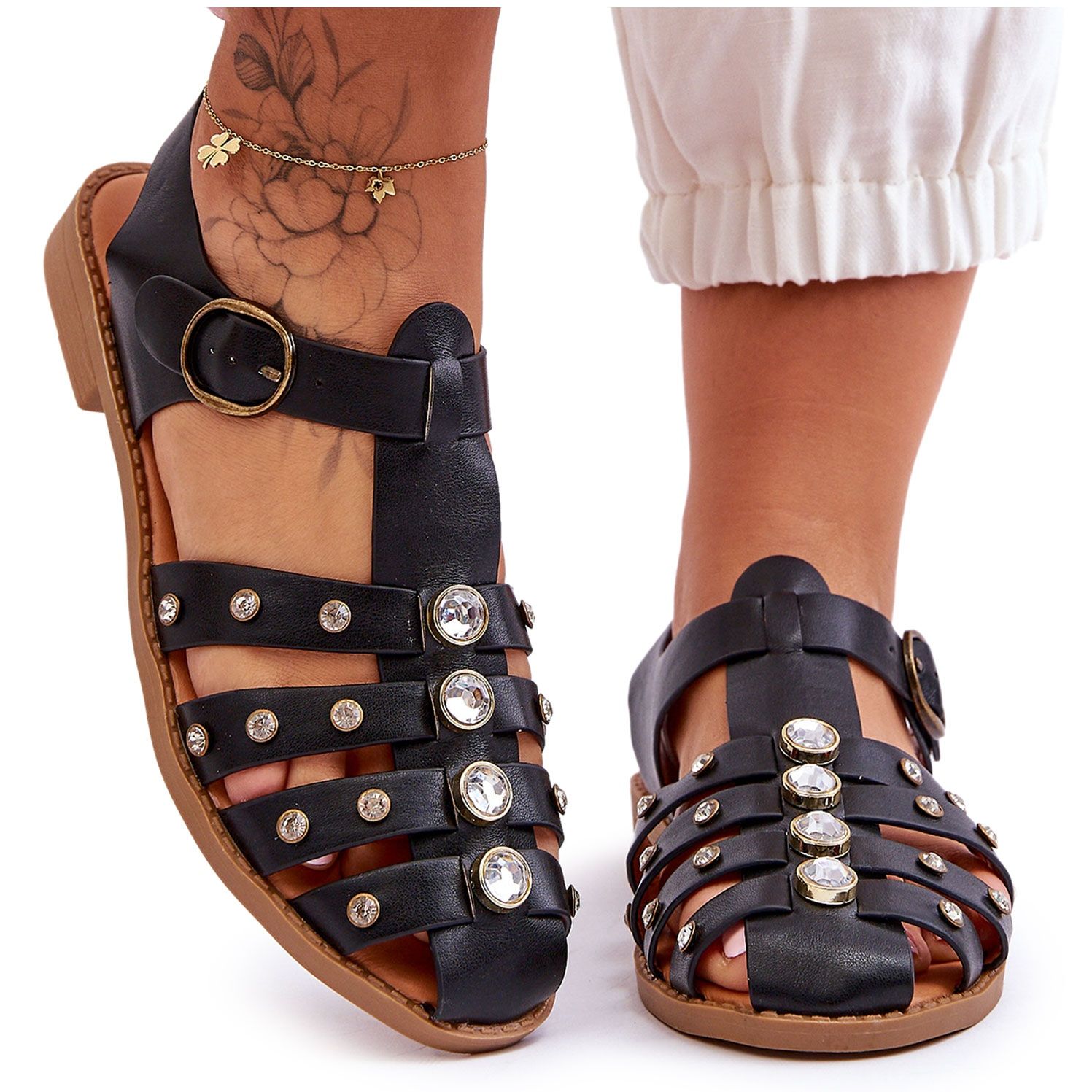 Sandali da donna eleganti e confortevoli realizzati in pelle ecologica di alta qualità. L'intera tomaia è stata decorata con spettacolari strass che imitano strass, che aggiungono bagliore e sottile eleganza - perfetta per le passeggiate estive, incontri con amici o uscite per le vacanze.