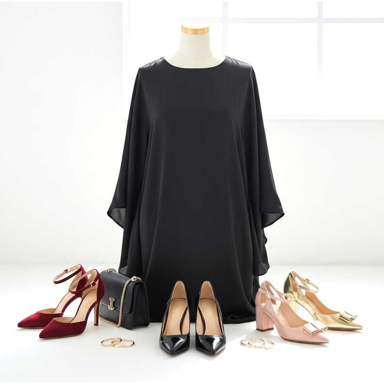 I tacchi alti neri si abbinano perfettamente alla tunica nera, creando uno stile monocromatico ed elegante. Puoi anche scegliere scarpe di colore contrastante - rosse, dorate o anche rosa - che ravviveranno l'intero outfit e gli daranno carattere.