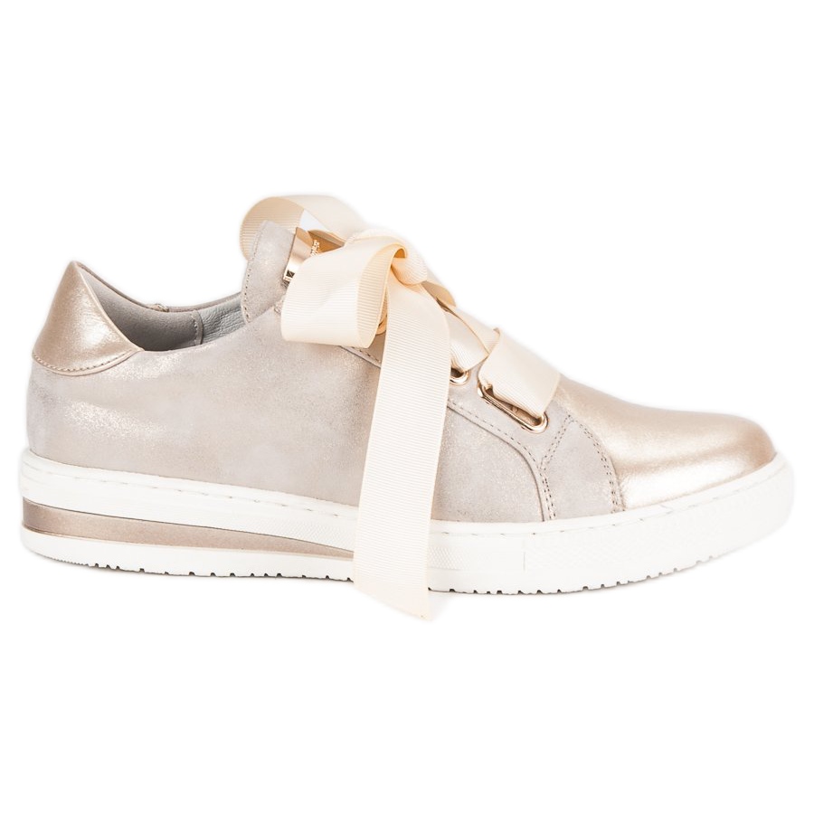 Realizzate in pelle ecologica di alta qualità, le scarpe deliziano con il loro delicato colore dorato, che aggiunge lucentezza e si distingue tra la folla. Larghi nastri beige funzionano come lacci, creando un dettaglio insolito ma molto elegante. Inoltre, il tallone è irrigidito, il che fornisce un eccellente supporto al piede, e la punta rotonda sottolinea il carattere classico della calzatura.
