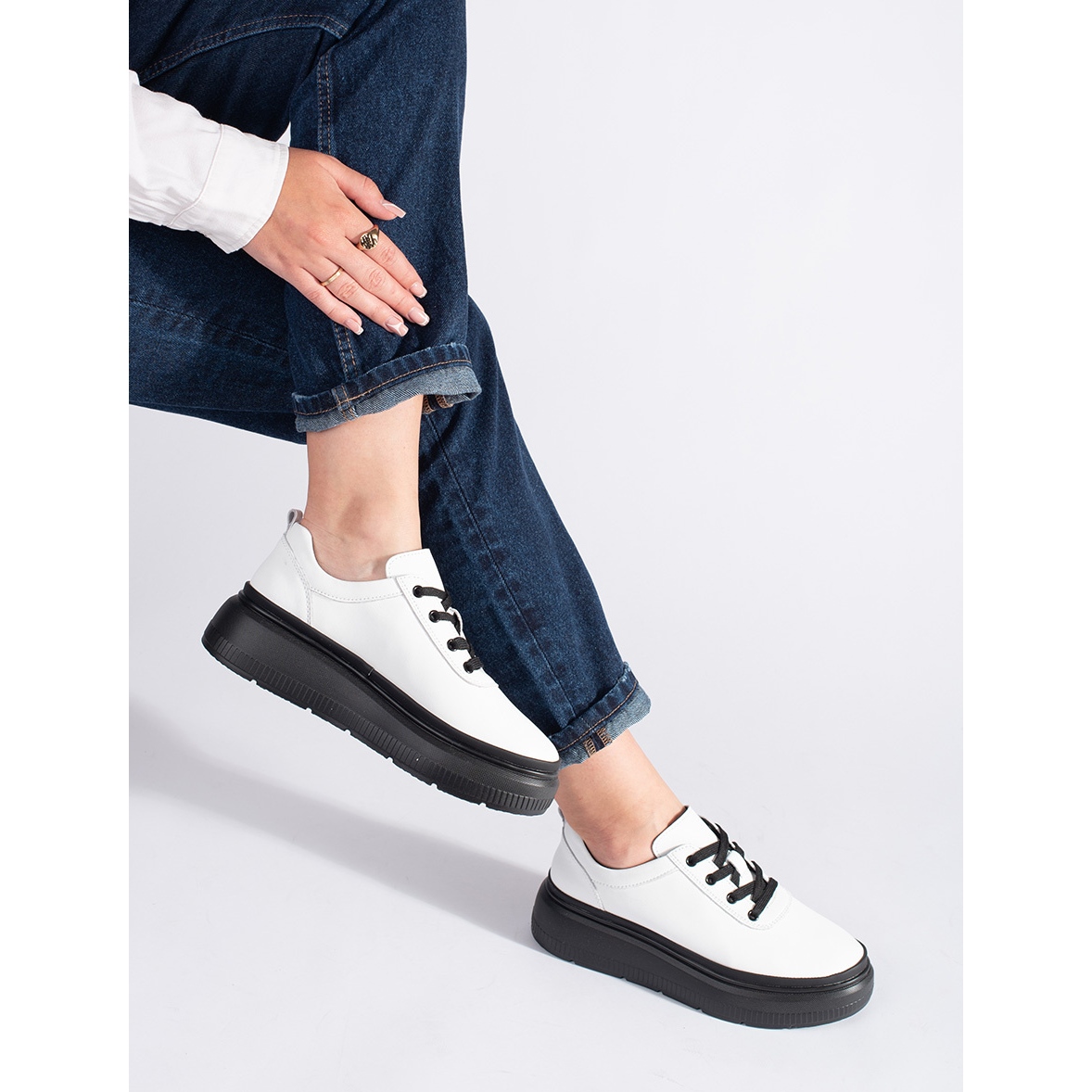 Dettagli: Scarpe bianche in pelle su una piattaforma nera bianca
