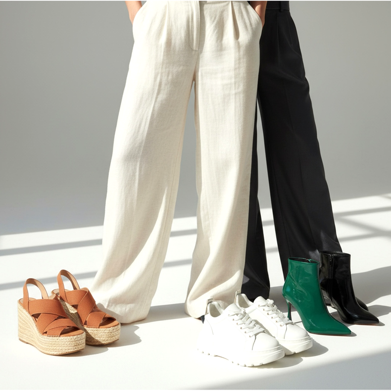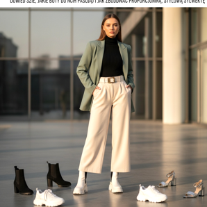 Non tutte le scarpe staranno bene con i pantaloni a gamba larga. Le ballerine con suola piatta e gambe lunghe e larghe sono una combinazione che può accorciare otticamente la silhouette, a meno che i pantaloni non siano adeguatamente accorciati fino alla caviglia. La stessa cosa accade con le sneakers basse, che si perdono sotto le gambe lunghe dei pantaloni, disturbando l'effetto complessivo.