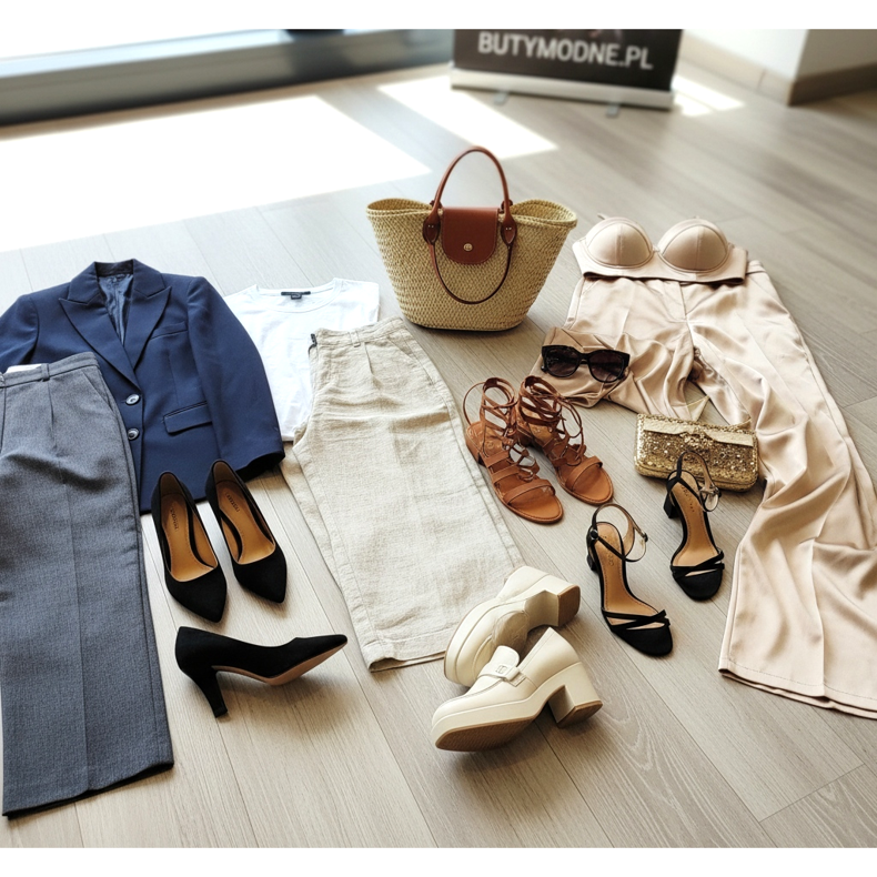 Per un weekend fuori porta: pantaloni larghi alla caviglia di lino chiaro o beige, maglietta bianca e sandali alla schiava o mocassini con la suola più spessa. Il set si completa con una borsa in paglia e occhiali scuri: vibrazioni estive totali senza esagerazioni. Per una serata fuori: pantaloni ampi in raso champagne o oro, corsetto aderente e sandali alti con cinturino alla caviglia. Eleganza pura, pronta per un'occasione speciale. Sfoglia le offerte su KeeShoes e componi l'outfit perfetto a gamba larga!