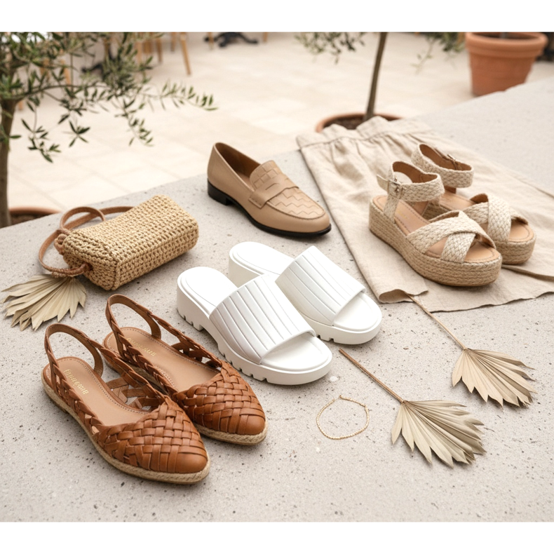Le scarpe intrecciate, invece, hanno una storia più lunga nella moda: basti citare gli iconici sandali italiani degli anni '70. Nella stagione primavera-estate 2026 tornano in versioni eleganti e urbane: ballerine realizzate con cinturini in pelle intrecciata sul retro, sandali con cestino in tessuto di iuta o mocassini con motivo intrecciato in rilievo. Abbinati a gonne o abiti in lino, creano un effetto tipico dell'holiday chic.