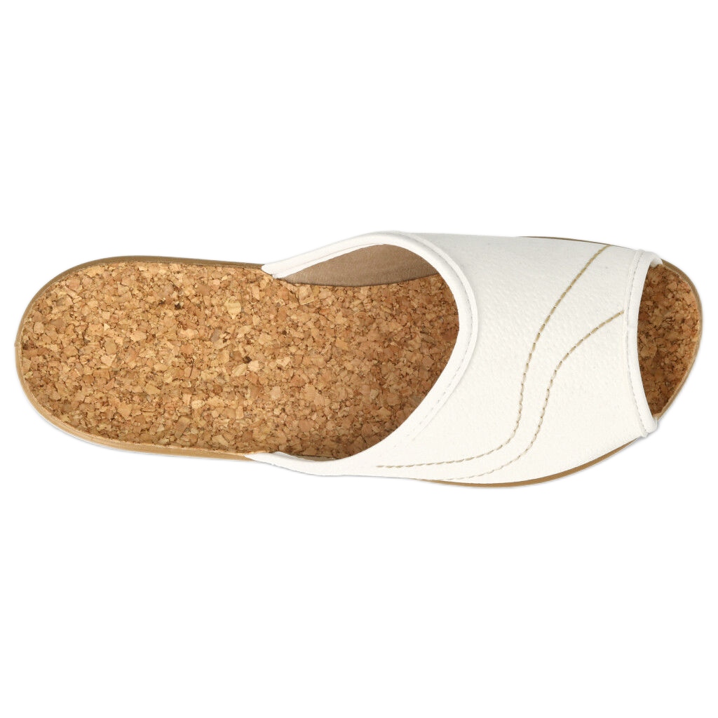 Il materiale della soletta è realizzato in materiale naturale e la pelle esterna ecologica garantisce comfort e rispetto per l'ambiente. La suola in PU garantisce flessibilità e durata, e il colore beige della parte inferiore delle infradito crea un insieme armonioso con la tomaia bianca.