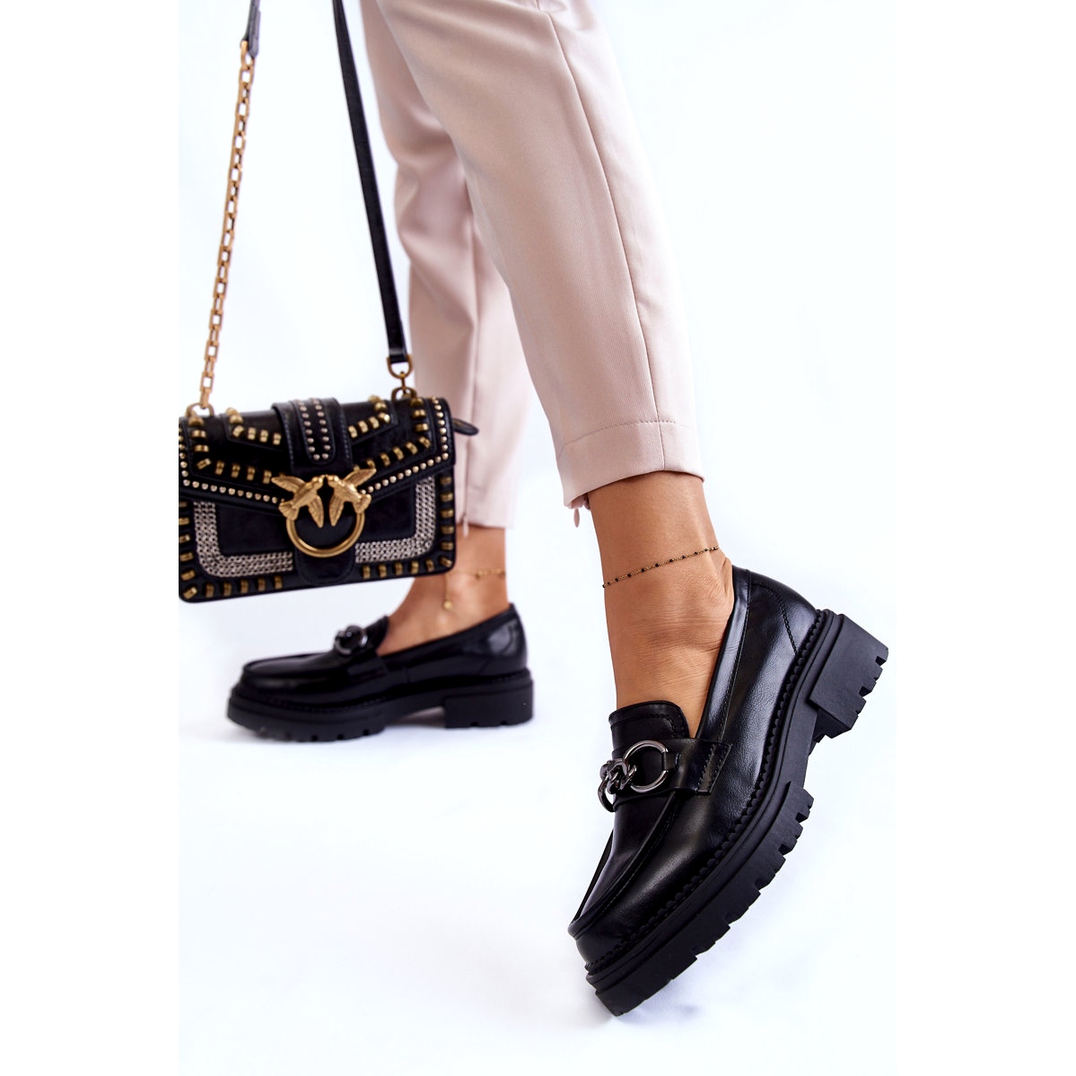 Scarpe da donna eco-piuma La.Fi-Stitylish Portes che combinano eleganza con il comfort quotidiano. Una tomaia liscia e nera in pelle ecologica di alta qualità è stata decorata con una catena decorativa che aggiunge carattere e rende le scarpe funzionanti sia per l'ufficio che per le riunioni con gli amici. Un naso classico, rotondo e uno slip -in fondazione garantisce comodo indossare e indossare tutto il giorno.