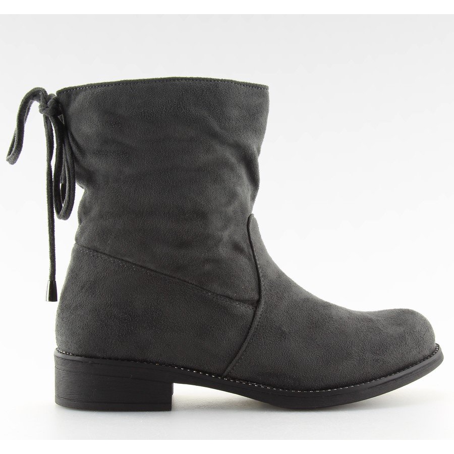 Stivaletti grigi con tacco piatto (circa 3 cm) realizzati in pelle scamosciata ecologica. Attirano l'attenzione con una tomaia delicatamente arricciata con un laccio decorativo sul retro, finiture lucide con piccoli zirconi e un fiocco discreto e strass. L'interno rivestito in morbida pelliccia garantisce calore e comfort. La cerniera laterale facilita l'indossamento rapido.