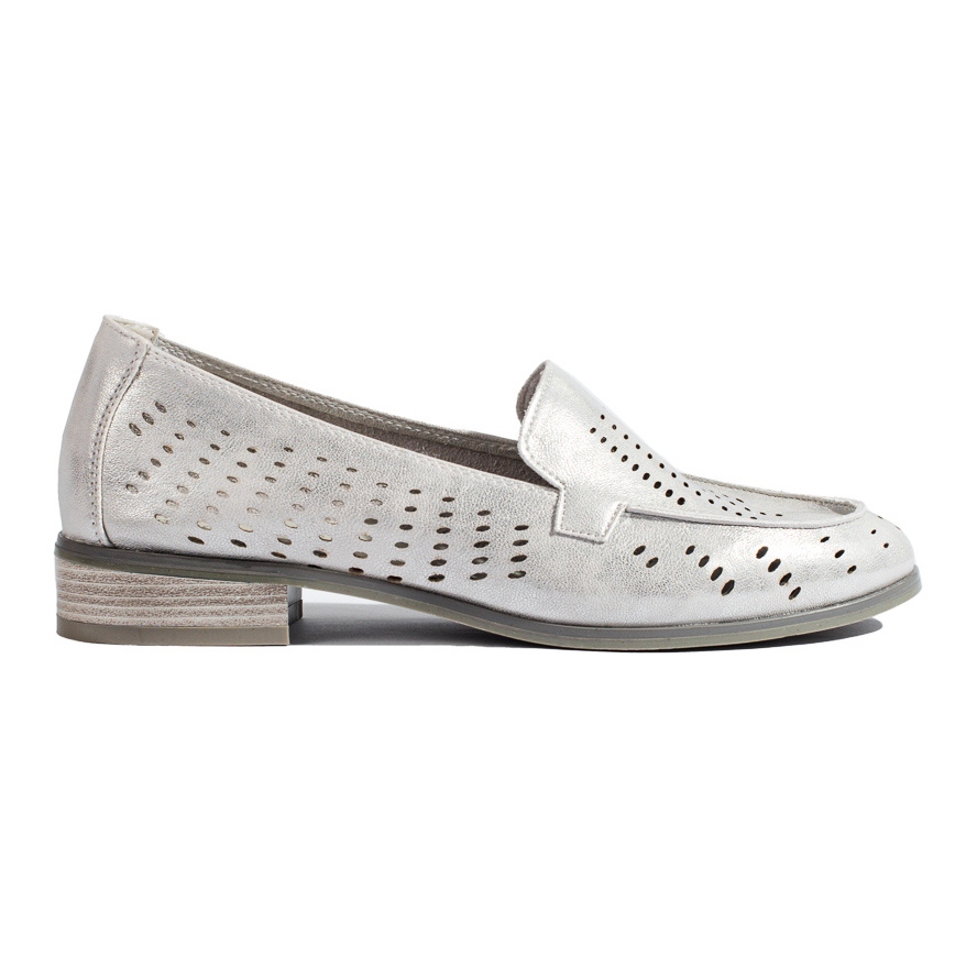 Il modello traforato argento di Potocki è una calzatura unica che attira l'attenzione con la sua lucentezza metallica e il motivo traforato sottile ma efficace. Questi mocassini da donna sono la scelta perfetta per le donne che cercano scarpe per l'uso quotidiano, ma anche per le occasioni speciali.