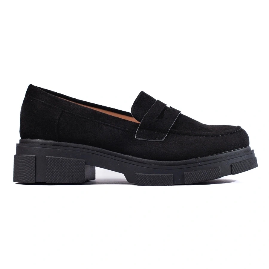 Scarpe nere eleganti e confortevoli realizzate in pelle scamosciata ecologica. Un taglio classico e casual di mocassini con naso pieno, rotondo, costruttore e morbido fissaggio e un comodo inserto di pelle ecologica. Perfetto per una base quotidiana - per lavoro, per una passeggiata e per le stilizzazioni urbane.