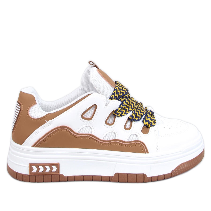 Queste scarpe sportive sulla piattaforma si distinguono per colori attraenti: il bianco classico combinato con accenti marroni li rende estremamente versatili e si adattano facilmente a vari stili. I lacci ampi e fantasia attirano l'attenzione e aggiungono l'intero carattere originale.
