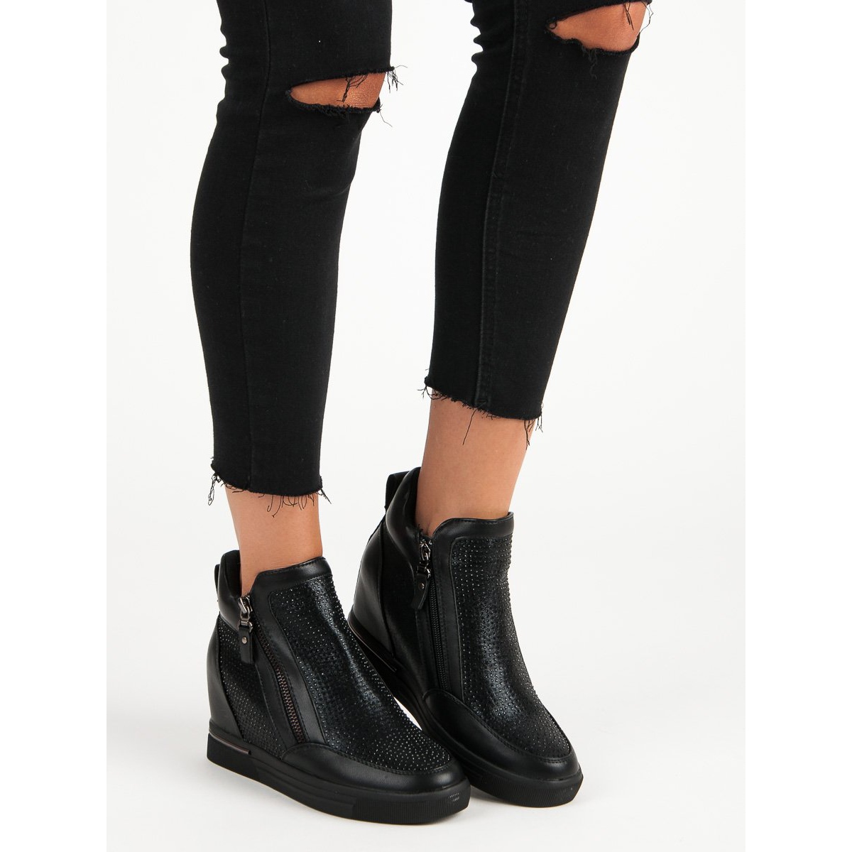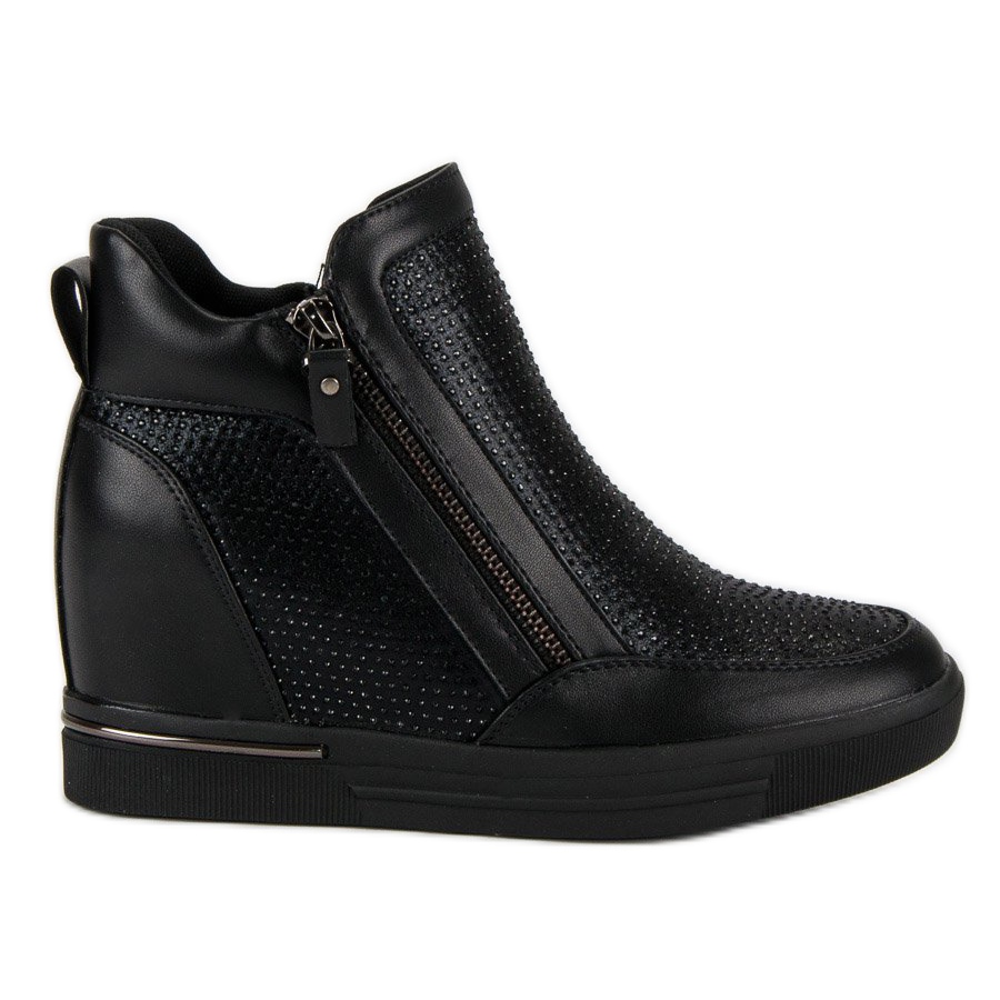 Le sneakers nere con cerniera sono la scelta perfetta per le donne che apprezzano sia lo stile che il comfort. Queste scarpe eleganti, chiuse con cerniera, si distinguono per i cristalli decorativi che conferiscono loro un aspetto chic. Grazie ad un tacco alto di 7,5 cm e ad un plateau nascosto di 2,5 cm, queste sneakers offrono non solo un effetto allungante della gamba, ma anche stabilità e comodità.