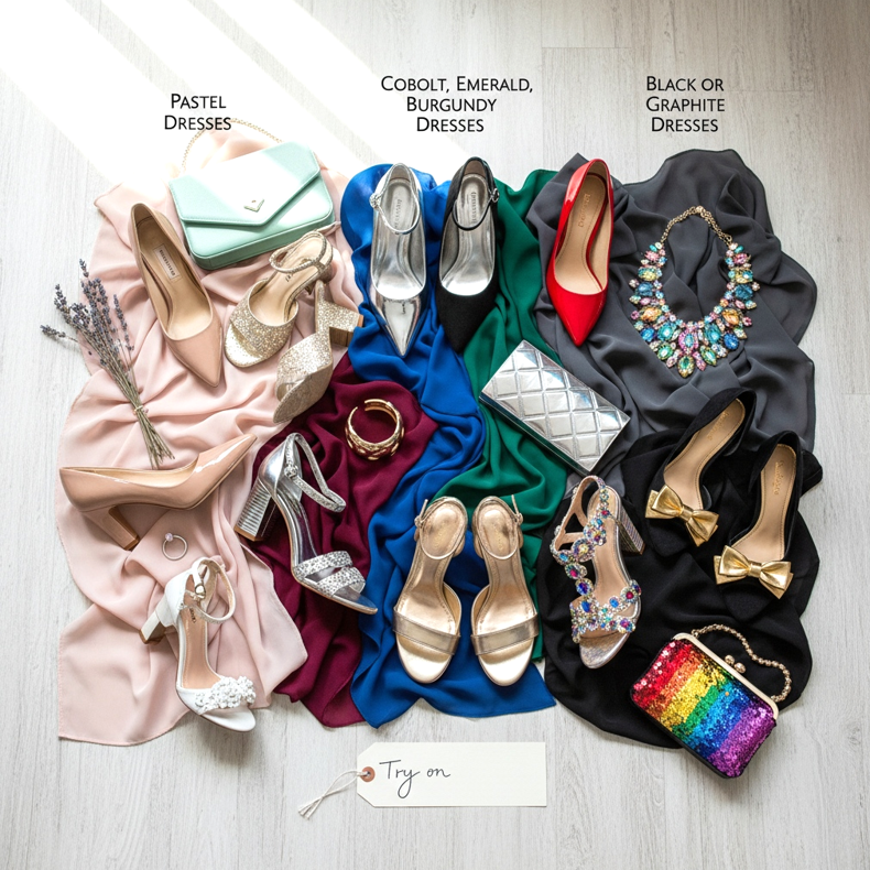 Abito cobalto, smeraldo o bordeaux: per i colori forti, scegli scarpe metallizzate oro o argento che non faranno concorrenza al colore del vestito, ma lo enfatizzeranno. Puoi anche scegliere il nero o il nudo: sempre sicuro e classico.