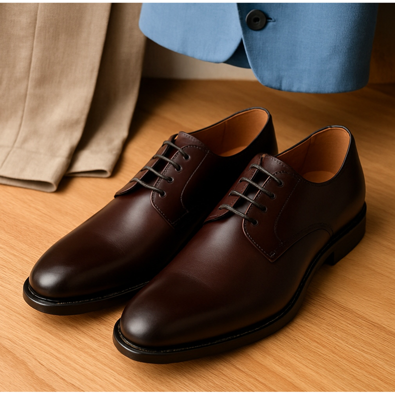 Le scarpe derby sono scarpe con lacci aperti, leggermente meno formali delle oxford, ma comunque assolutamente adatte per un matrimonio. Sono particolarmente adatti per matrimoni rustici, feste in giardino o celebrazioni estive. Un derby liscio in marrone scuro o bordeaux è una scelta eccellente per abiti beige, oliva o blu. Il derby in tinta unita (senza broccato) è più formale rispetto ai modelli con decorazioni. Questa è un'ottima opzione per gli ospiti che apprezzano il comfort: le scarpe derby sono generalmente più comode se indossate per periodi di tempo più lunghi.