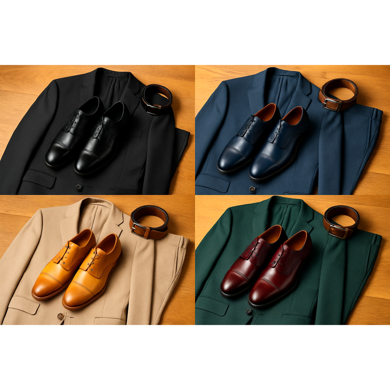 Regola base: le scarpe nere si abbinano ad abiti neri, blu navy, antracite e grigio scuro. Le scarpe marroni (dal marrone chiaro al cognac fino al marrone scuro) si abbinano bene con abiti beige, grigio chiaro, blu e verdi. Non abbinare mai scarpe nere con una cintura marrone o scarpe marroni con una cintura nera: la cintura e le scarpe devono essere dello stesso colore. Le scarpe bordeaux (sangue di bue, bordeaux) sono un'alternativa universale: si abbinano sia agli abiti scuri che a quelli chiari. Evita le scarpe marrone chiaro per i matrimoni molto formali.