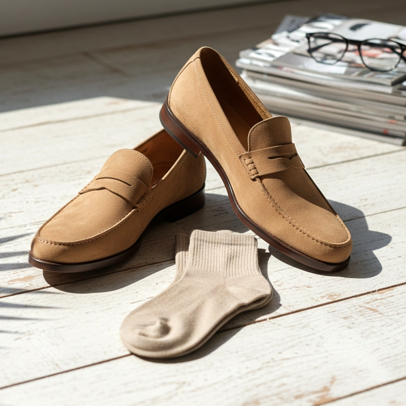 La scelta migliore per l'estate sono i mocassini. Sono eleganti ma meno formali delle oxford. Puoi scegliere i classici mocassini penny o i mocassini con nappine. Se il dress code lo consente, indossateli senza calzini visibili (utilizzando calzini scollati, i cosiddetti calzini invisibili). La caviglia esposta aggiunge leggerezza e freschezza allo styling.