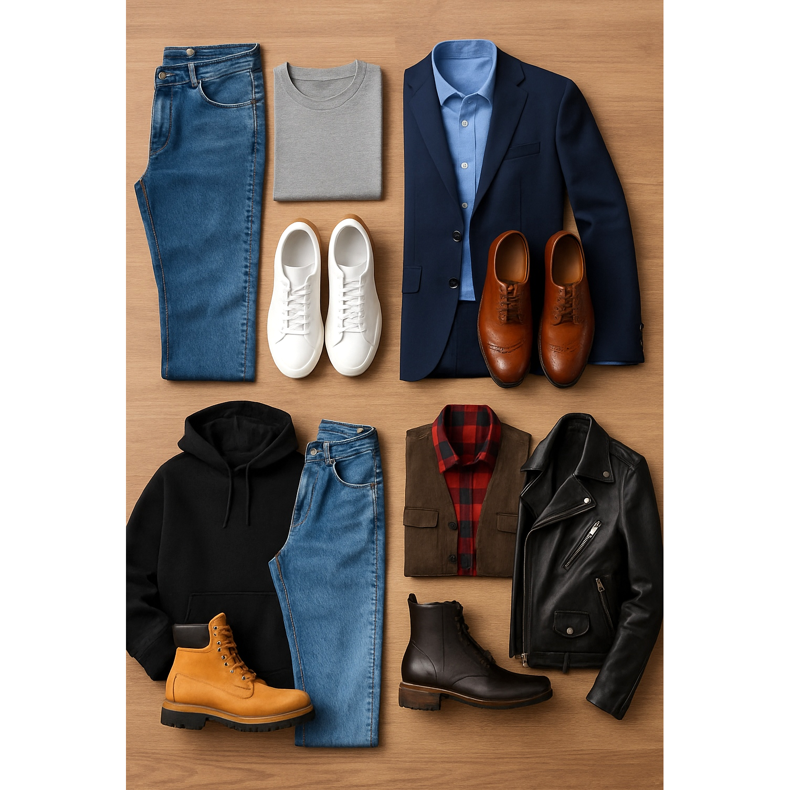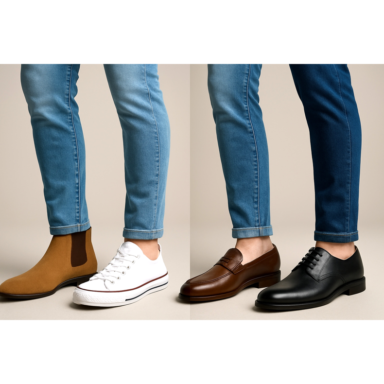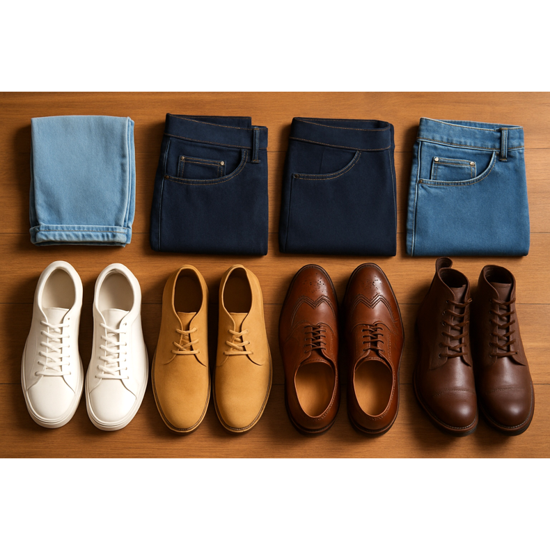 Una guida completa per selezionare le scarpe da uomo per vari stili di jeans. Impara le regole dello styling dallo slim fit al baggy e scopri gli abbinamenti perfetti.