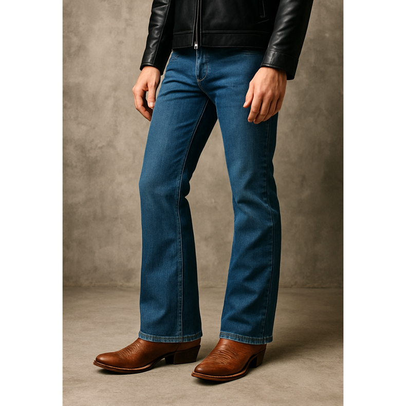 I jeans bootcut e flare sono caratterizzati da un'estensione dal ginocchio in giù, creata appositamente per le scarpe alte. Le vestibilità migliori sono: stivali da cowboy (stivali western), stivali Chelsea, stivali jodhpur, stivali da lavoro, stivali alti con lacci. Le gambe dovrebbero coprire la tomaia, cadendo leggermente sopra la scarpa. Evita le scarpe da ginnastica basse: sembreranno perse sotto i pantaloni a gamba larga. I jeans bootcut scuri con gli stivaletti Chelsea neri e una giacca di pelle creano un look rock. I pantaloni a zampa luminosi con stivali da cowboy marroni conferiscono allo stile un'atmosfera boho-country. Questo taglio di jeans è tornato in auge nella moda maschile moderna.